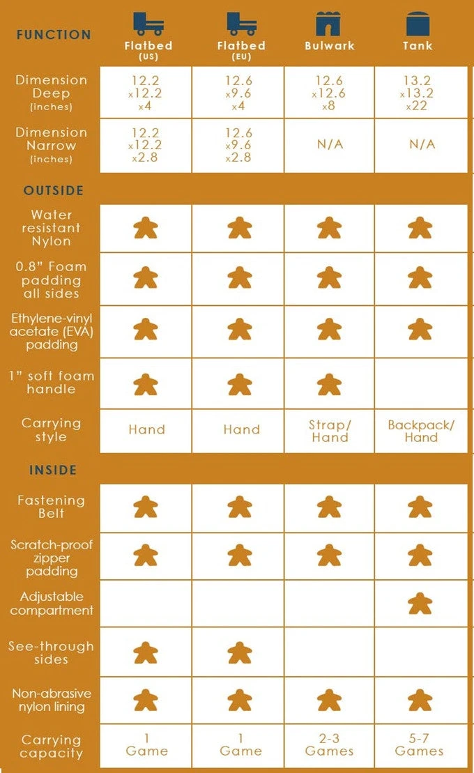 The Bulwark features a carrying capacity of 2 heavy duty games like Caverna or 3 narrower games like Dixit. The Bulwark comes with a diagonal strap-on that you can wrap it flat on your back while you carry. So the bag won’t be doing rope jumping while you walk, run, bike, climb, dance…yes you get the point. This also means your games won’t be taking hits from bumping, after all, no games deserve a punch (maybe except for those you allowed to be webbed in the attic). It is padded with extra protection, scratch-proof padding on the zipper and reinforced handled much like the Flatbed.Â