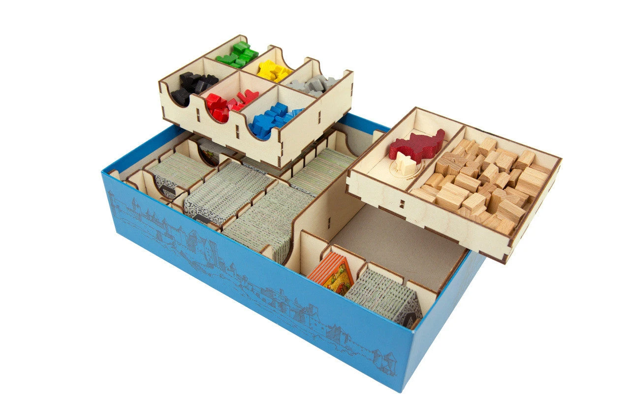 Much like the fortified, French town, you want to keep your tiles, tokens and pieces “walled in” and protected in your box! Our Carcassone organizer holds the base game and many expansions (please refer to product images and below* for which expansions we have in ours). Seven rows for your tiles and the eight adjustable dividers let you keep your expansions separated. The two removable token trays hold meeples, abbots, wagons, barns, shepherds, tower pieces, a dragon, and more! Extra space above the tiles allows for other expansion pieces (like a bag of sheep).