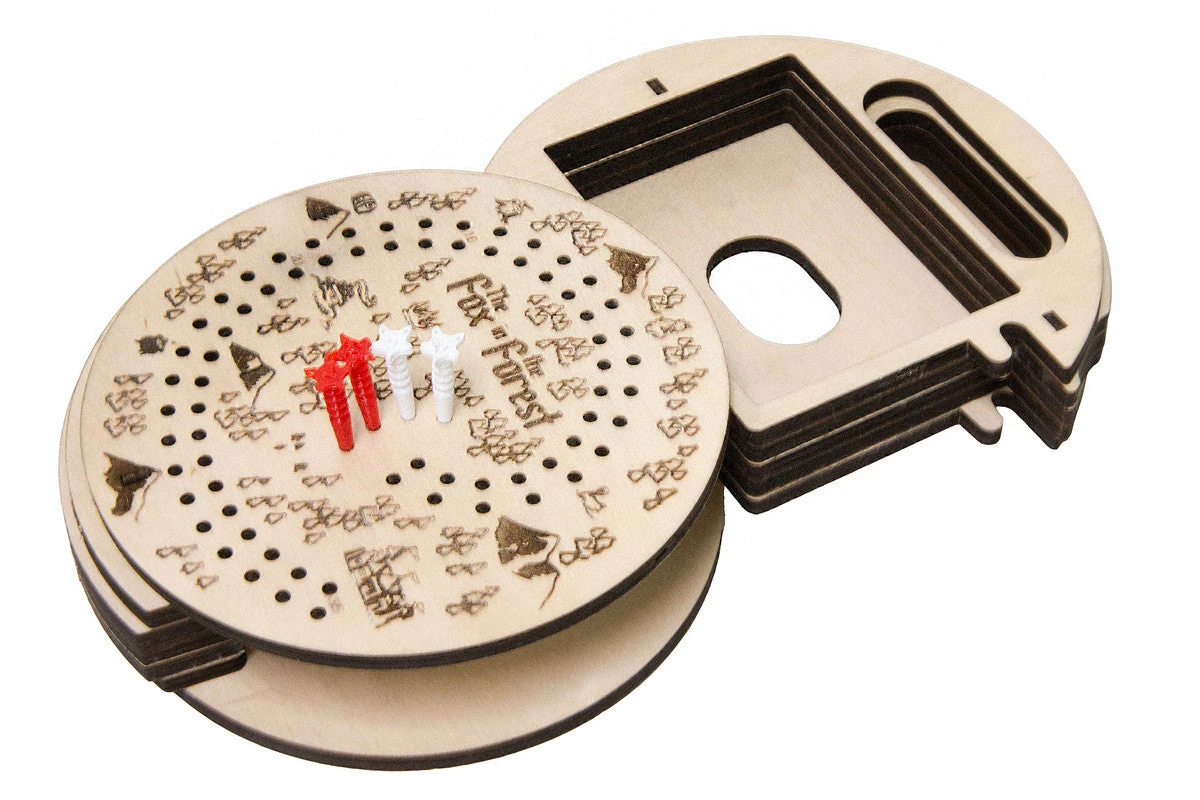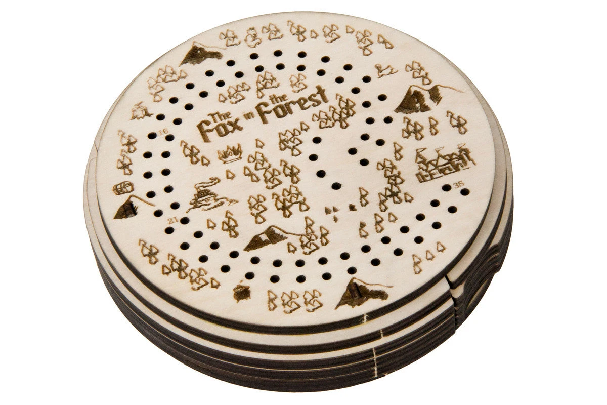 This travel kit houses all cards from the game sleeved or unsleeved, and is engraved with thematic art and a scoring track. This feature combined with the included fox themed pegs allows you to store and play The Fox in the Forest without the original box or scoring tokens; perfect for the car, plane, train, or cafe.