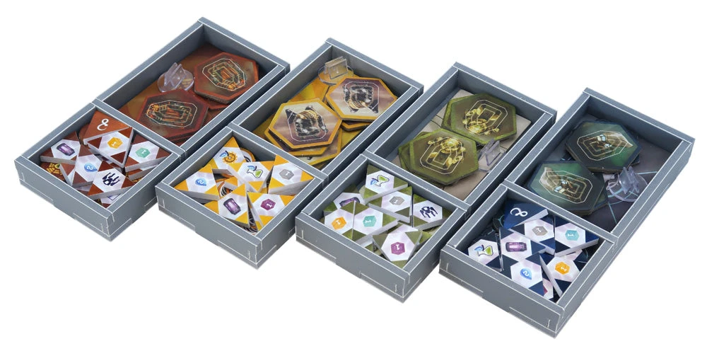 The trays are arranged in up to two layers. The insert also works with the metal resource cubes and resin player & energy core tokens.