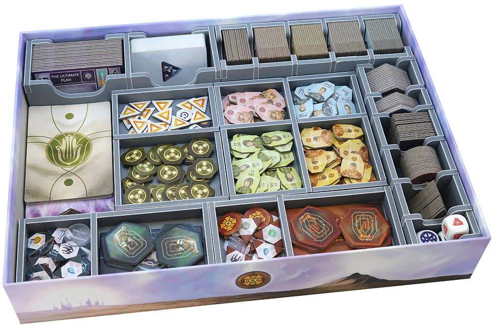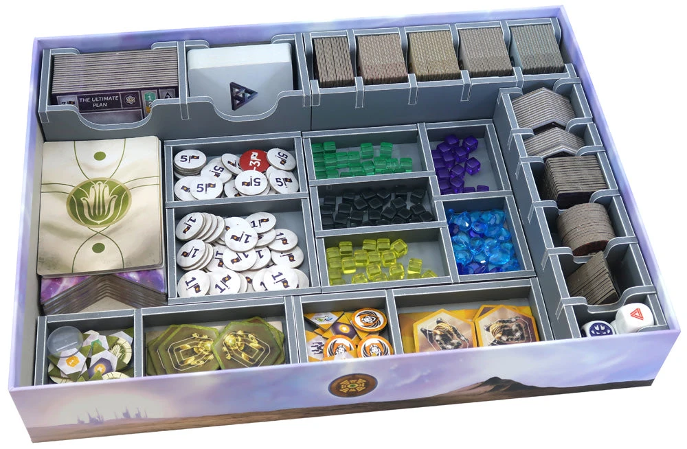 The insert includes trays for storing and organizing all the game components. Each component type has its own slot, and all the trays can be used during game play. Each player receives their own player tray, and there is space for all cards to be sleeved.