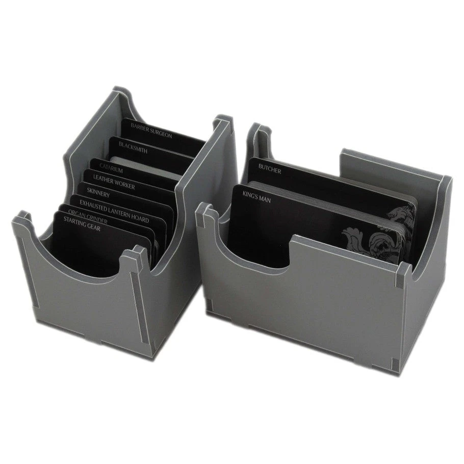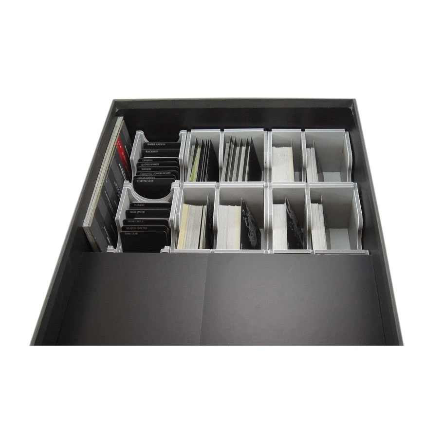 Insert for Kingdom Death Monster® expansions, providing space for 560 more standard sized cards and 300 more gear cards. The insert is intended to be used together with the FDSKDM-1 insert, and together they will fill the game box.