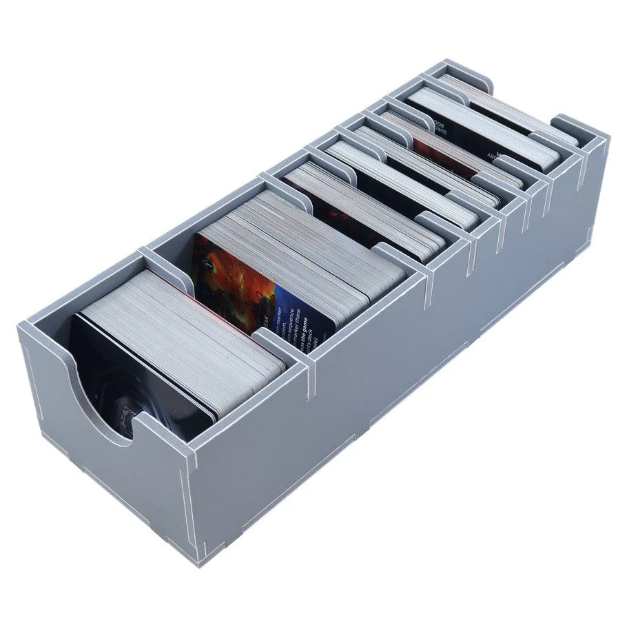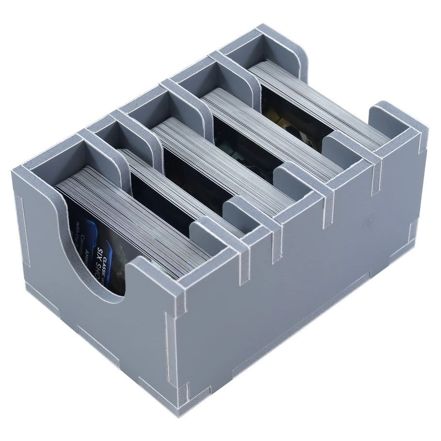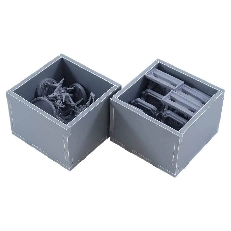 Insert compatible with Nemesis: Lockdown, and includes space for the Nemesis Lockdown: Stretch Goal content. The design provides both efficient storage and improved game play. The trays can be utilised during the game, and they greatly aid set-up and clear-away times. The rules and boards act as a lid on top of the trays. The insert is arranged in up to four layers as shown below. Note that the character boards are stacked with the card holders and scanner in the top right corner. The hexagon room tiles are stacked centrally in the bottom layer.