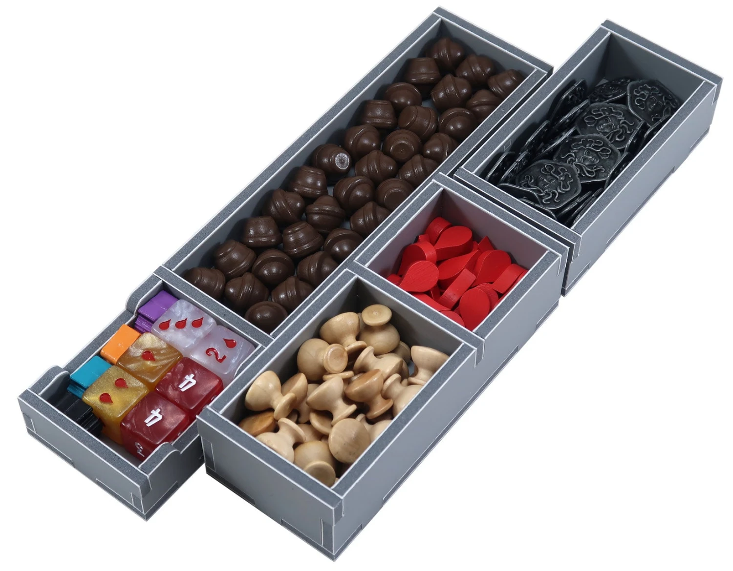 The insert includes trays for all the game pieces and cards. The two card trays have space for all cards to be sleeved with quality sleeves. The trays for workers and resources have higher end pieces in the shape of two horses heads. These hold the player boards in place when the box is fully loaded.