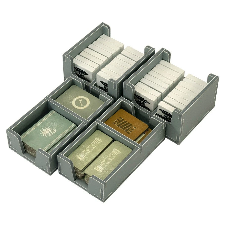 expansion. The design provides both efficient storage and improved game play. The trays can be utilized during the game, and they greatly aid set-up and clear-away times. The rules and boards act as a lid on top of the trays.