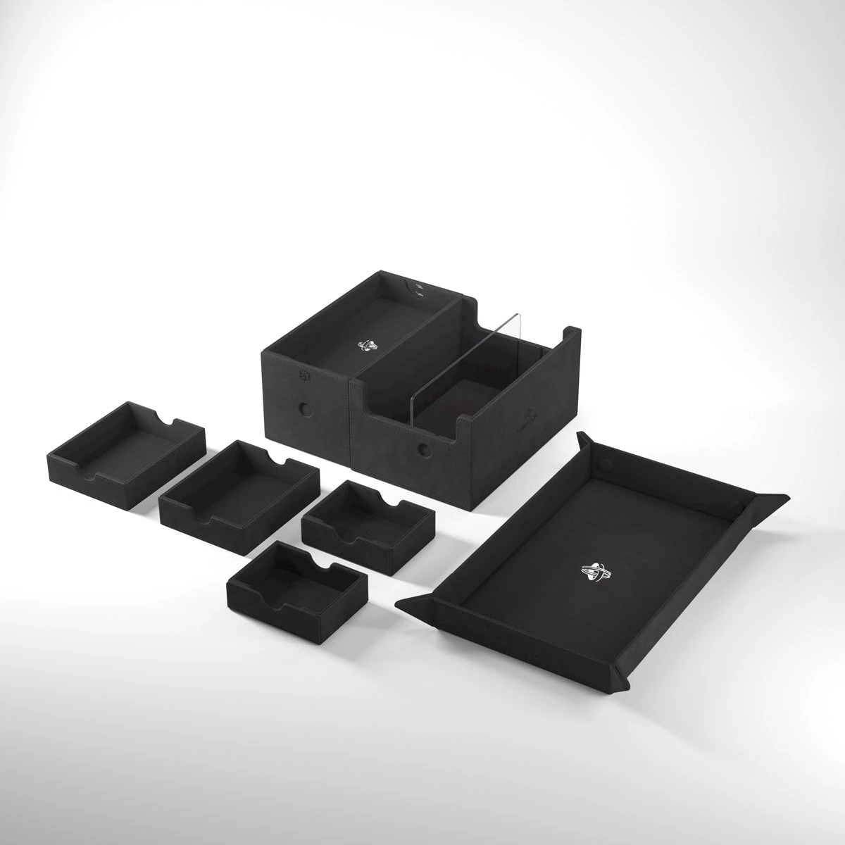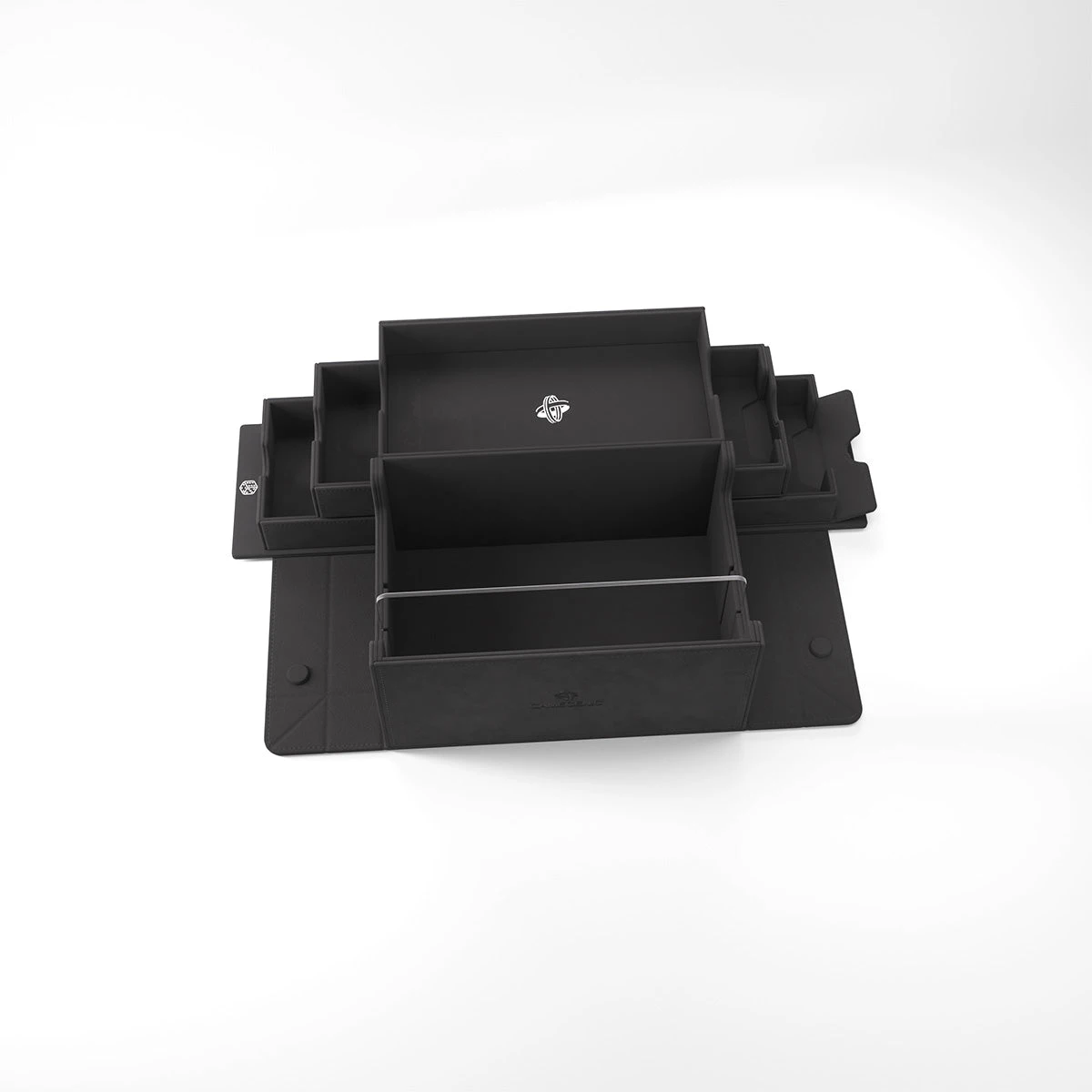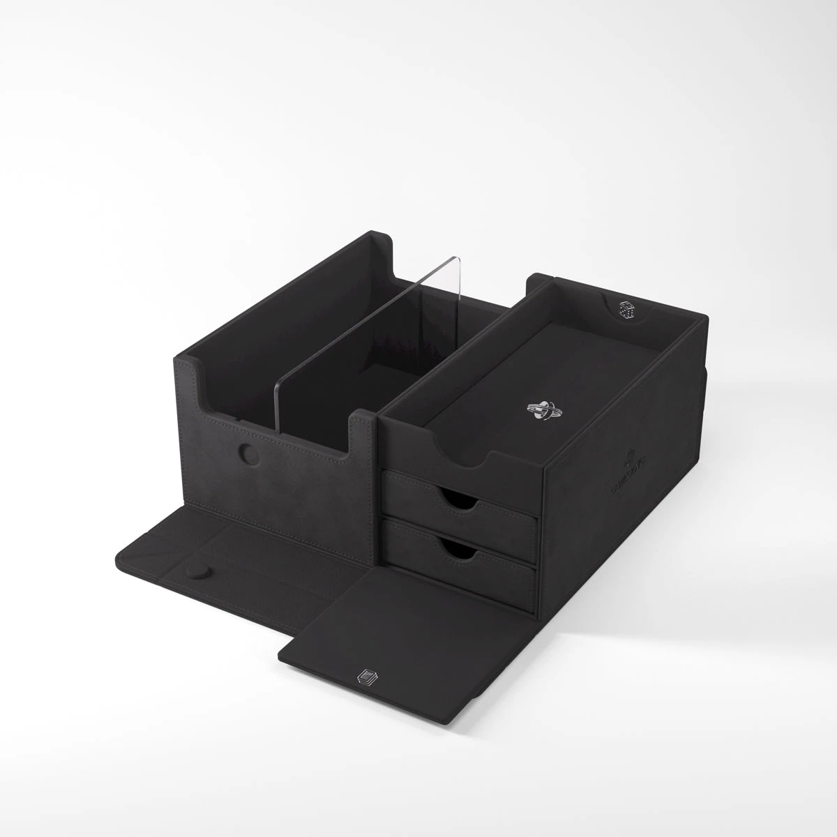 This multi-functional premium box is designed to perfectly fit 400 double-sleeved, or 540 board game-sleeved cards*. Two removable drawers with ingenious magnetic flaps provide easy access to tokens, sleeved cards, or full decks. The top compartment can be used to store played cards, accessories, or as a mini dice tray.