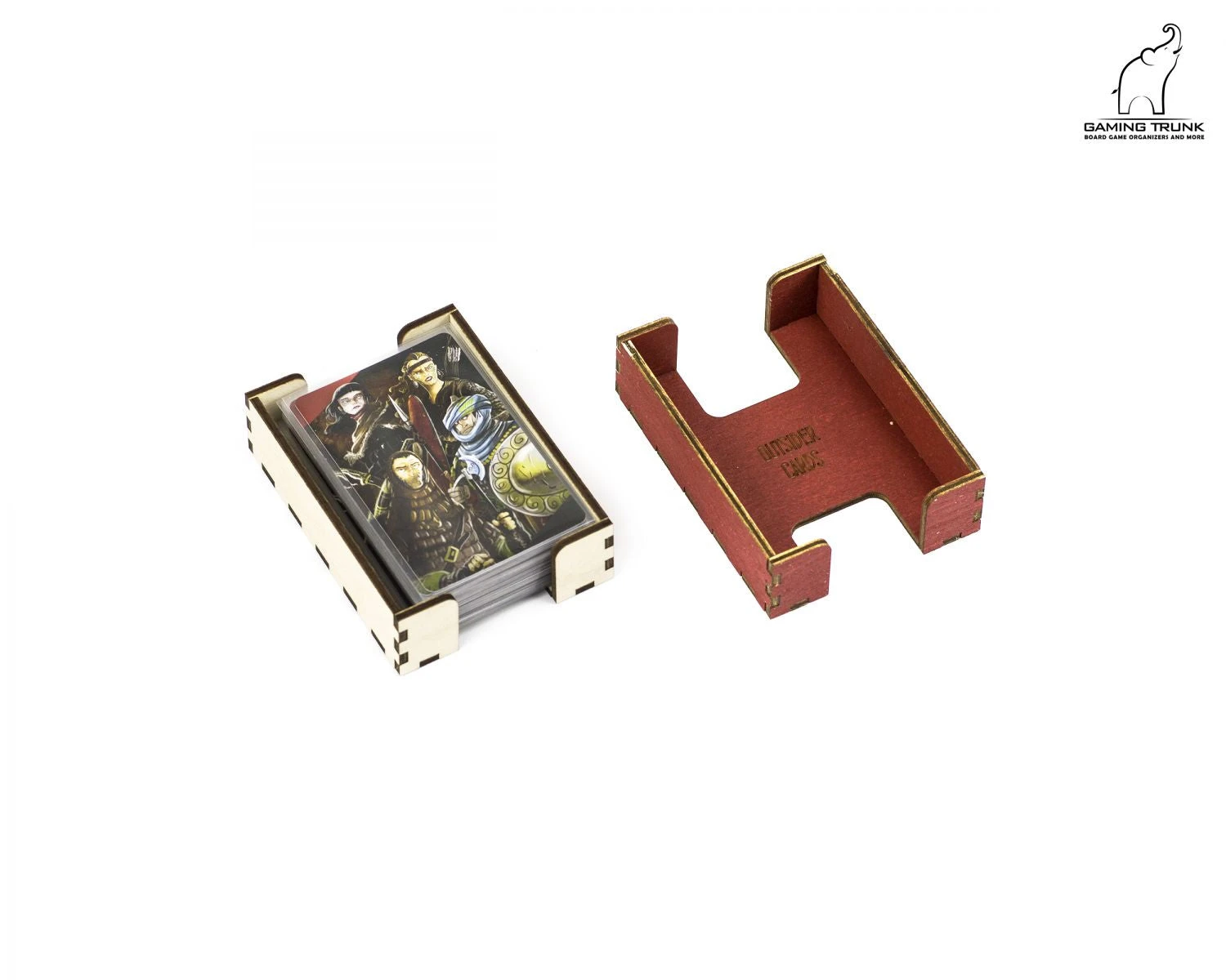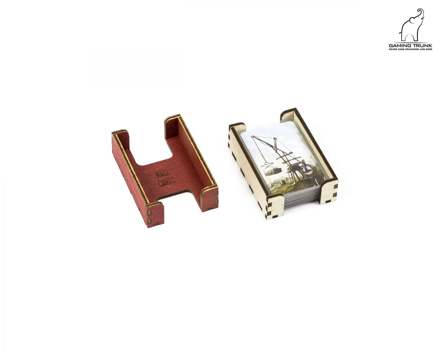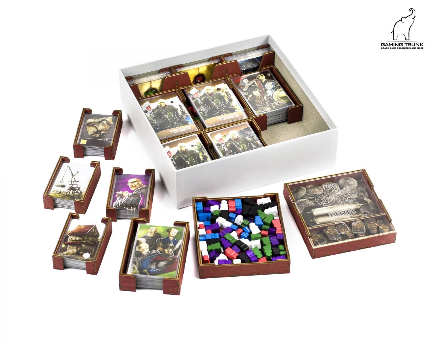 The 4 small card trays store the Debt, Suspicion, Tavern, and Wall cards. These card holders support sleeved cards up to 48×71 mm @100 mkm. The trays are removable from the box and help keep cards organized during the game.