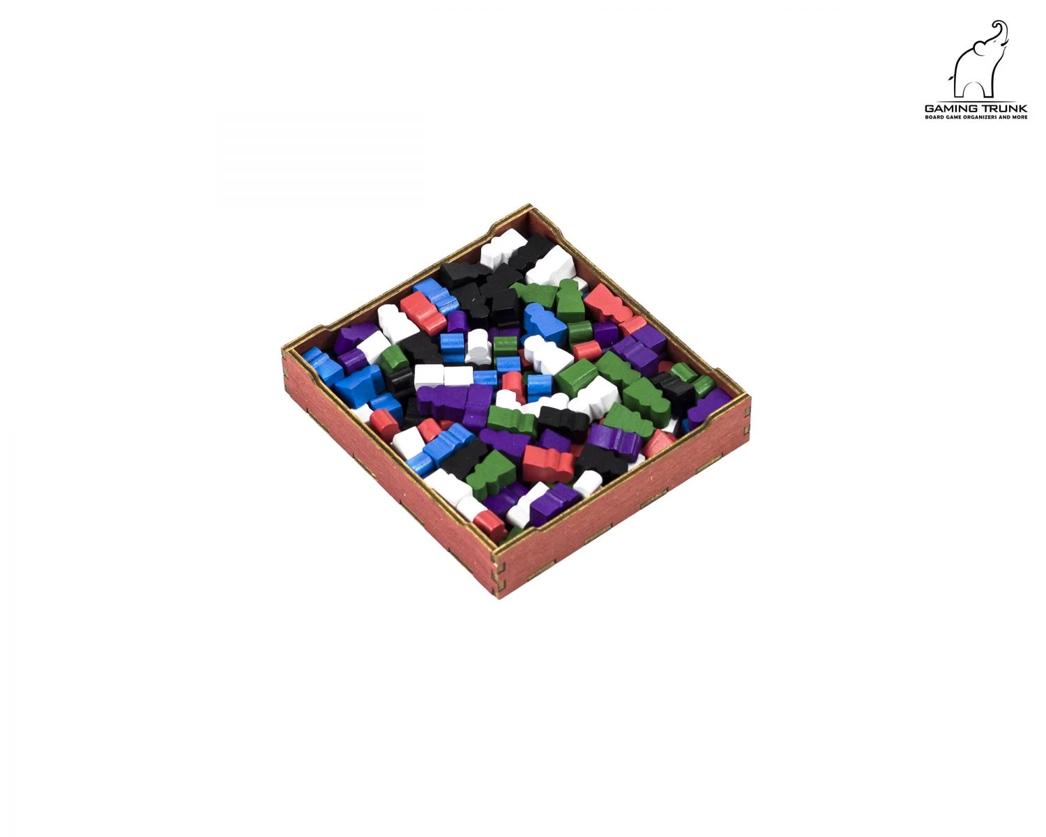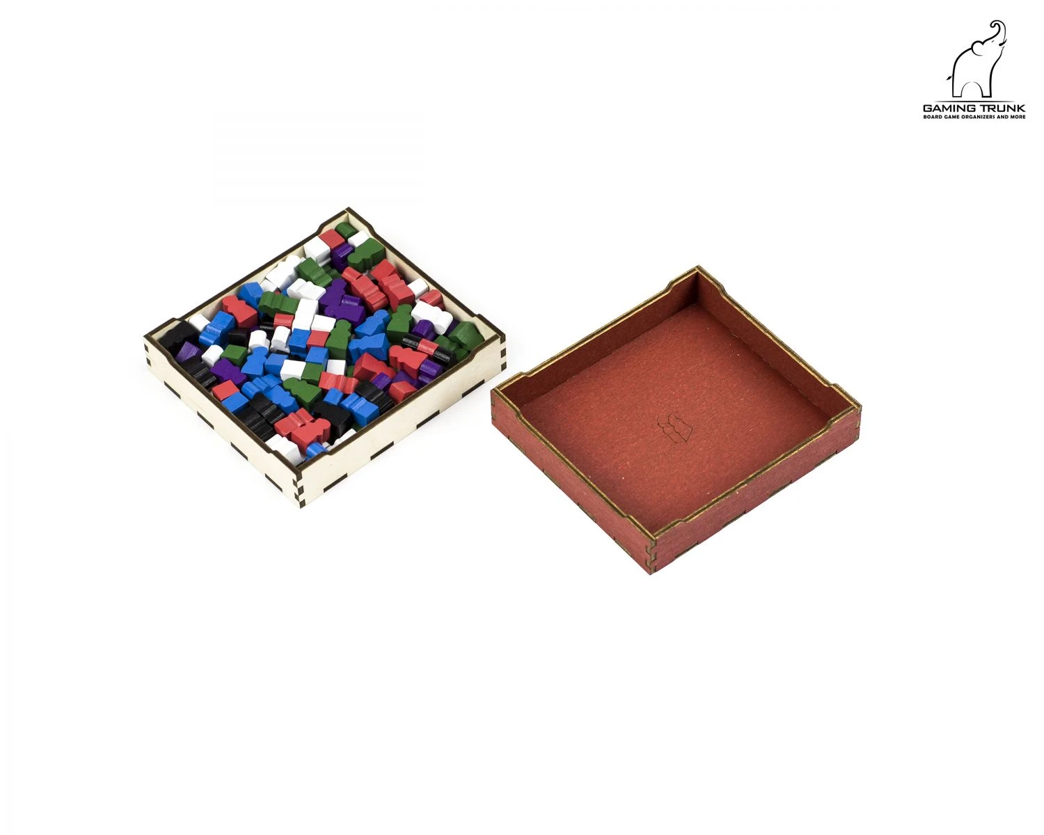 The four player tokens trays hold Workshops, Outposts, Monks, Jars, and Attribute Markers. The Paladin cards are stored on the top of the tray. These trays support sleeved cards up to 91×66.5 mm @ 100 mkm. Each player receives a separate tray with all tokens required to play.