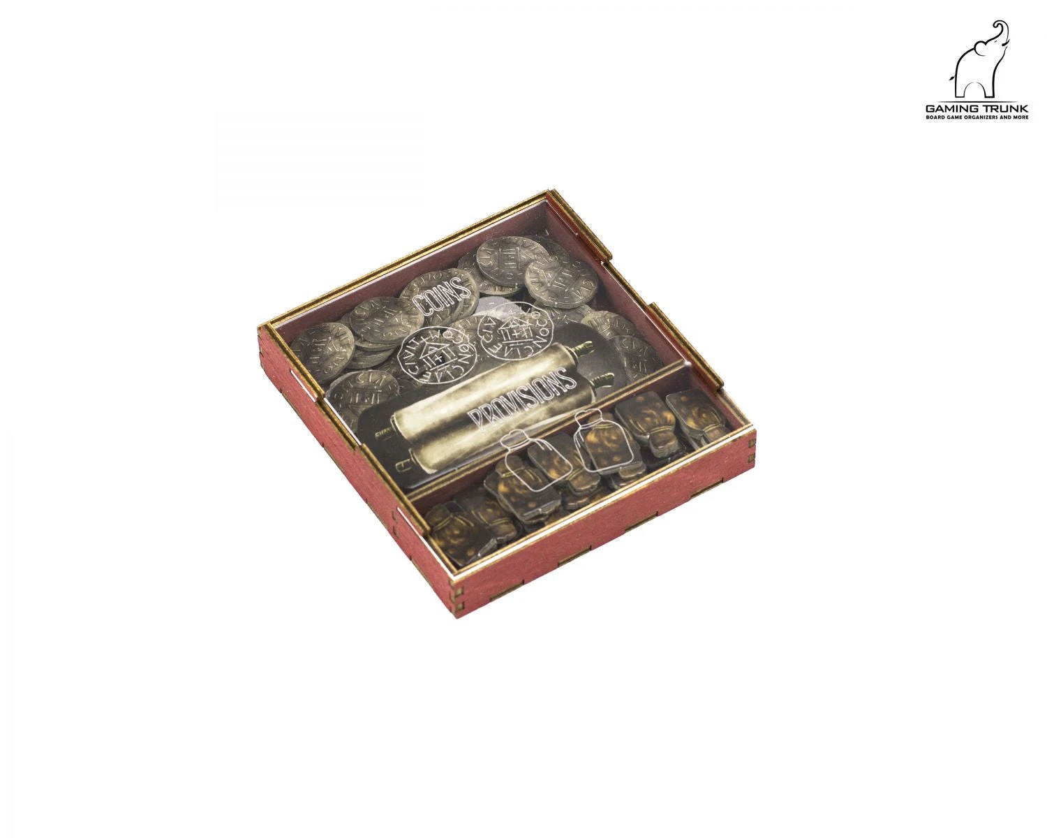 The coin tray stores coins and provision tokens. It supports metal coins however, it does not fit cardboard and metal coins simultaneously. A clear plastic lid holds the coins in place during vertical storage or transportation.