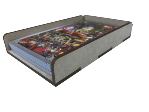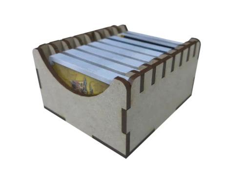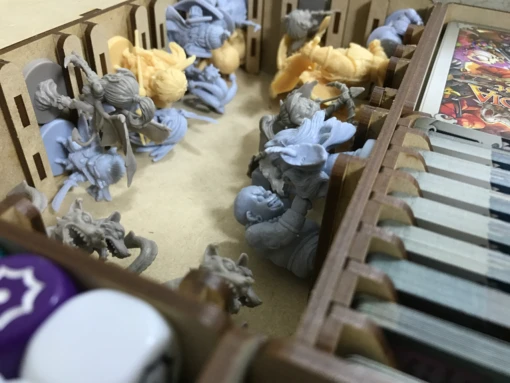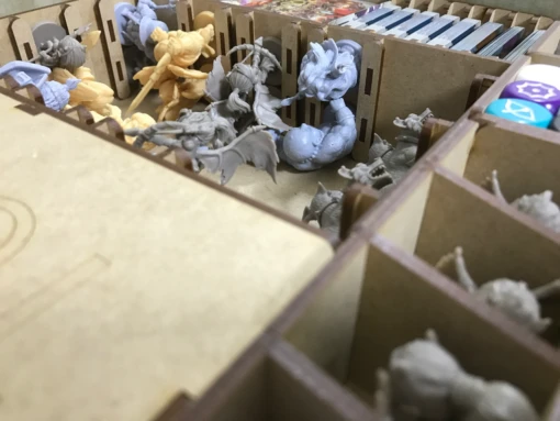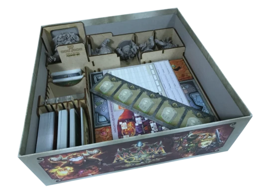 Our storage solution for Arcadia Quest: Inferno base game provides storage for minis, jumbo cards, large cards, small cards, tokens, and map tiles in eight custom trays.  This solution is designed to be placed in a base game box.