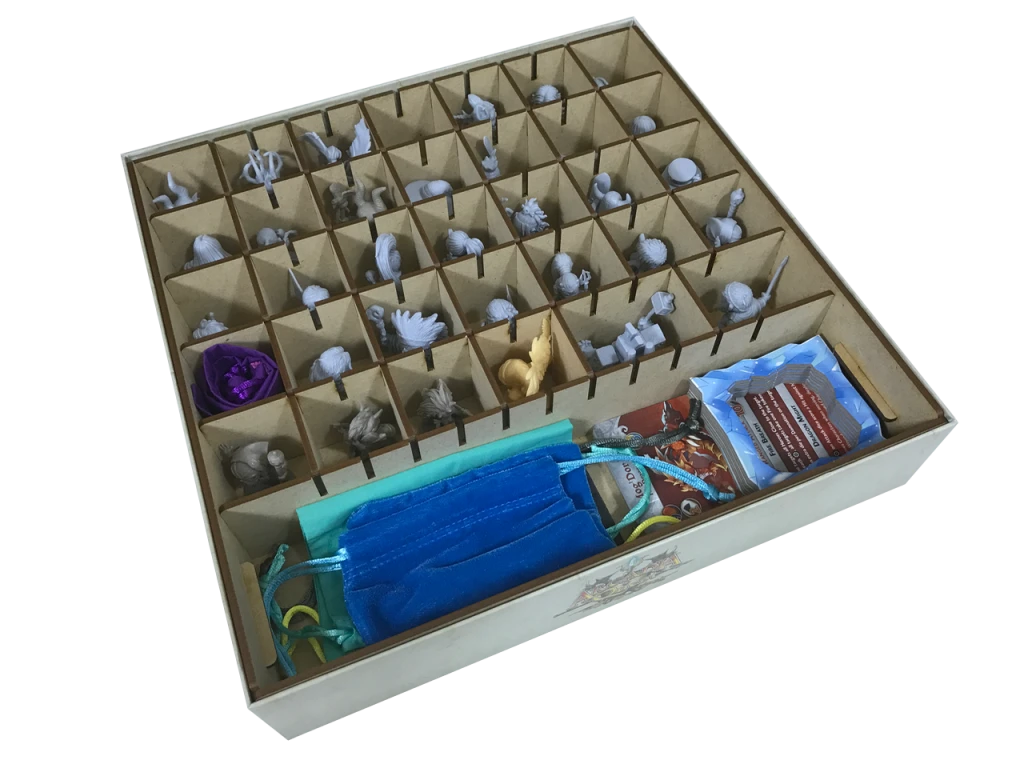 Our storage solution for Arcadia Quest: Inferno Hell of a Box provides storage for minis, dragon tokens, jumbo cards, dice bags, and other items.  This solution is designed to be placed in a Hell of a Box.  If you received a Hell of a Box as part of your Kickstarter pledge, you will definitely benefit from the minis and card storage with this solution.