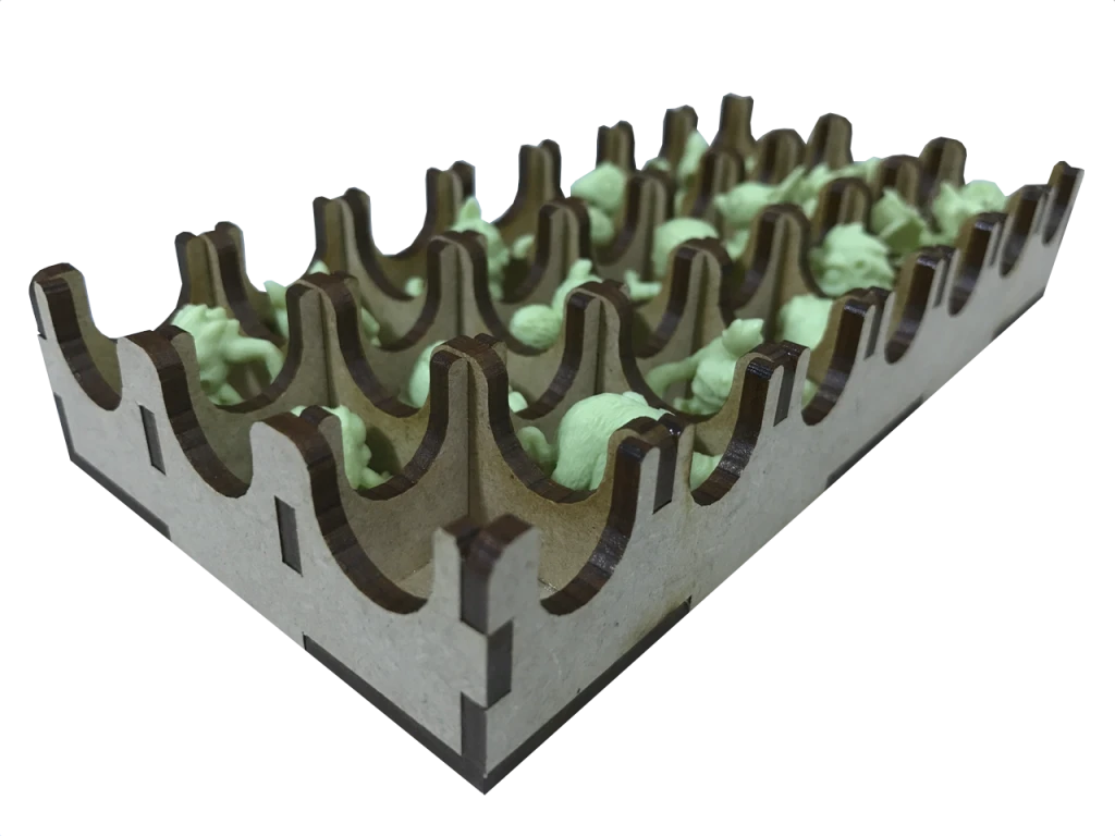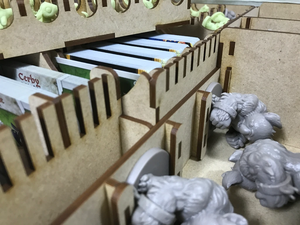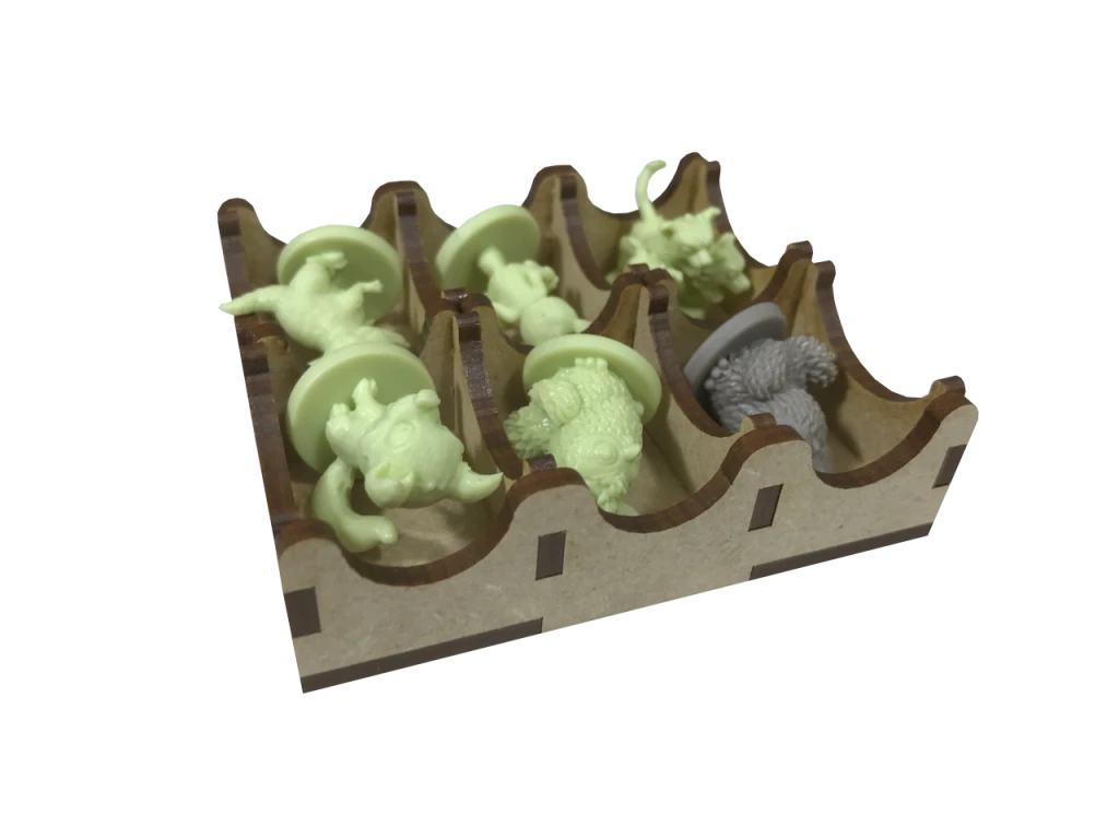 Our storage solution for Arcadia Quest: Inferno Pets provides storage for minis, large cards, small cards, and map tiles in four custom trays. This solution is designed to be placed in a Pets box.