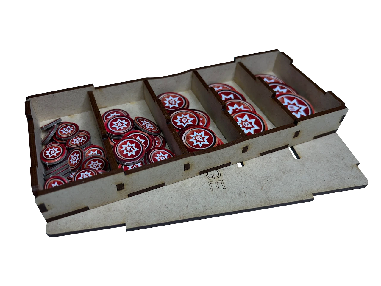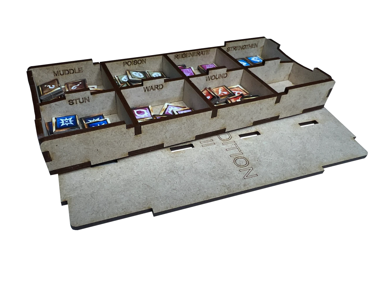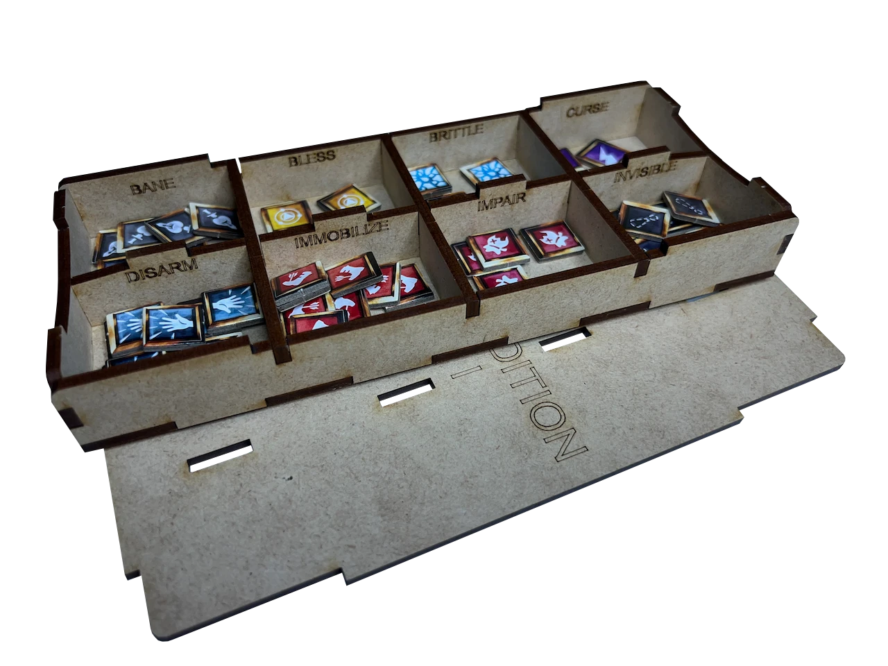 - two (2) removable, lidded condition token trays with etching for each condition token type