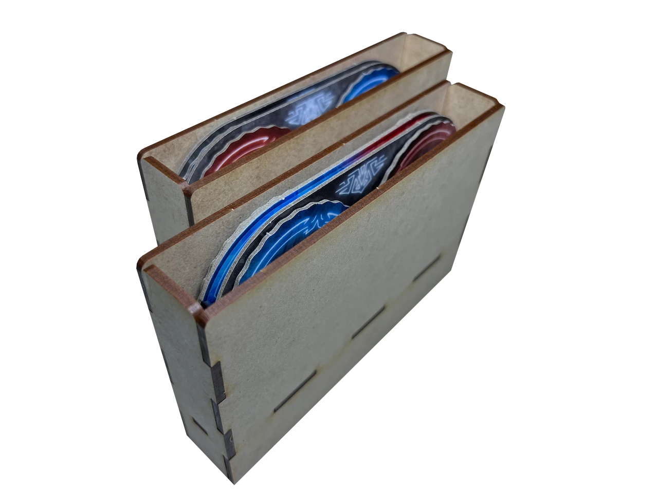 As with our Gloomhaven solution, our approach with this organizer provides dedicated character trays for each character.  This approach uses more wood and laser time, but results in the least fiddly approach possible when retiring and starting new characters.  It also allows for multiple concurrent games, as long as your characters in each party don’t overlap.