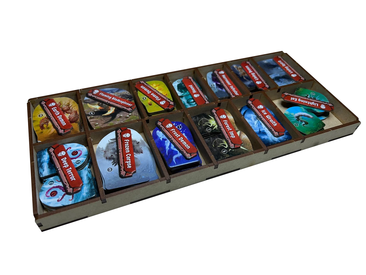Frosthaven initiative tokens are used to identify the monster tiles. Â The multiple uses (and names) for various terrain tiles made it very challenging to etch those item names; however, the terrain tiles in Frosthaven are very distinct in shape and coloration and our use of the trays during scenario setup has found etching is not needed. Â We do provide etching in cases where a tray is lidded and the contents are not obvious.