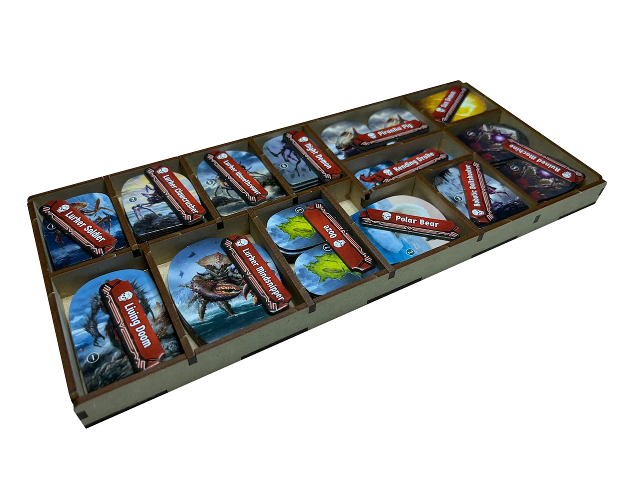 - seventeen (17) removable, lidded character trays providing storage for small cards, large cards, mini(s), tokens, and character dashboard