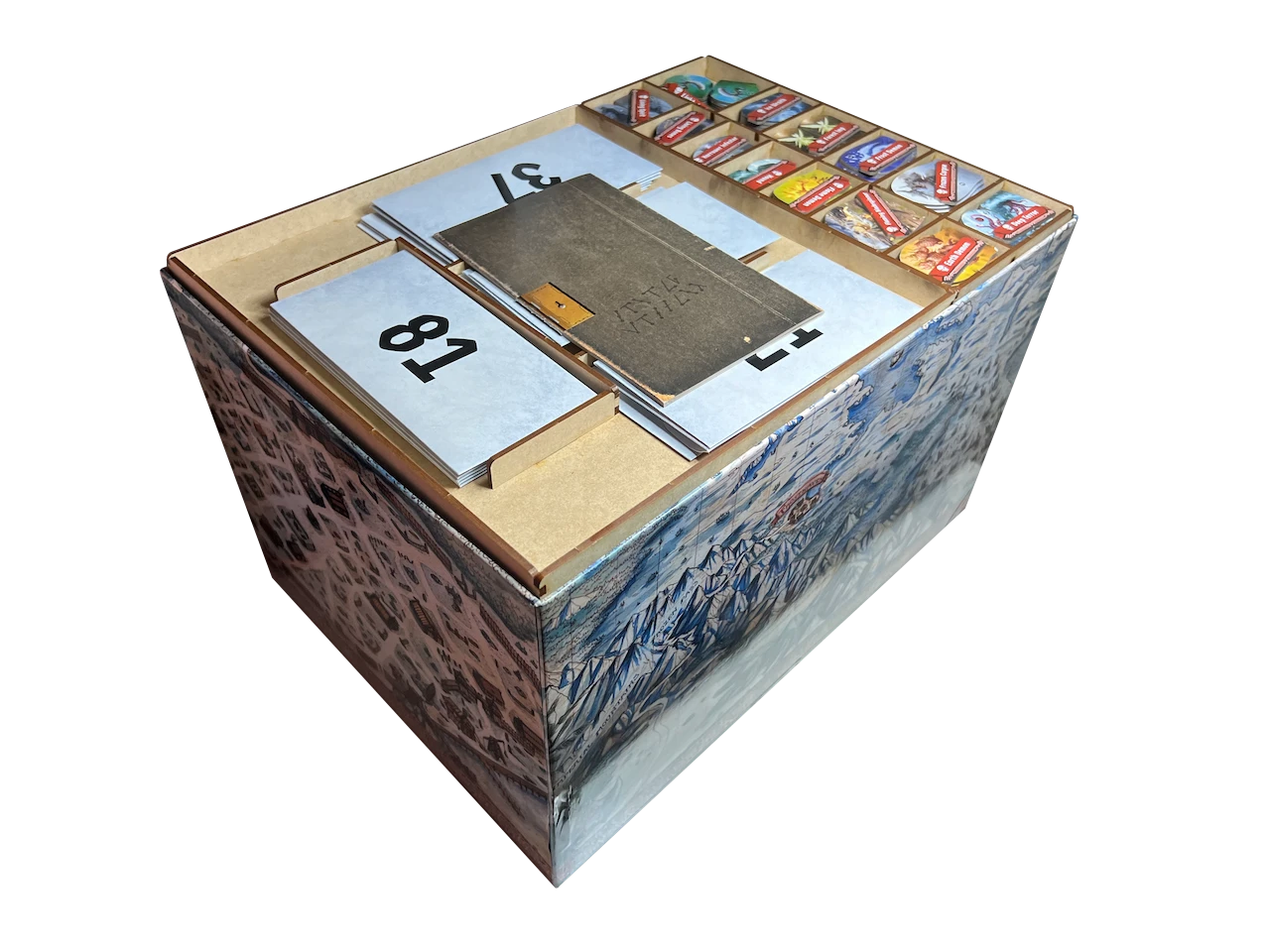 The Go7 Gaming Organizer for Frosthaven provides thirty-nine (39) trays of storage! Â This solution provides storage for all of the contents of Frosthaven, except for map tiles. We offer a top tray (FH-002) for map tile storage if you prefer a solution that has all Frosthaven contents stored in the same box. Â You may also want to consider an accordion file folio to store and divide your map tiles.