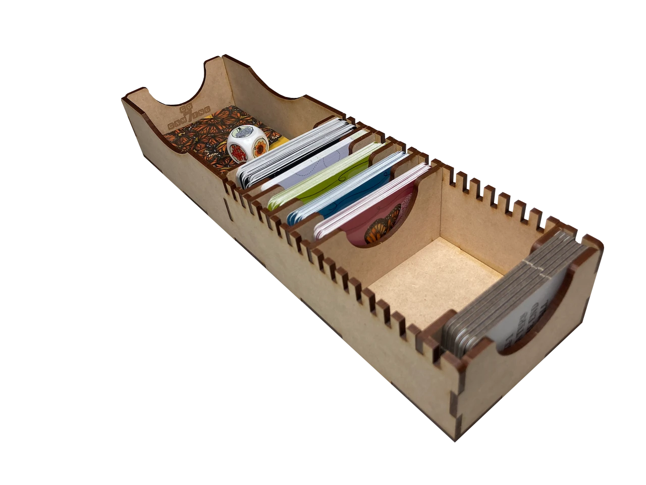 - one (1) large, removable card tray that supports sleeved and unsleeved cards