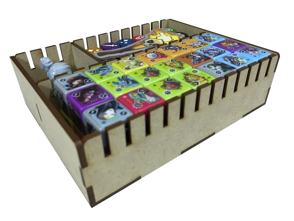 - dice tray – adjustable for retail or kickstarter storage + room for a mini or other items