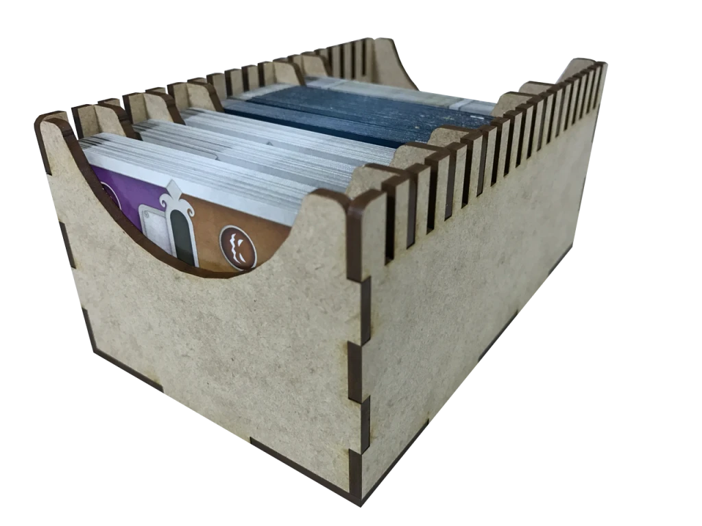 - card tray (69.9mm high x 93mm wide; sleeved or unsleeved, depending on your sleeve thickness, you may not get to use all the dividers).