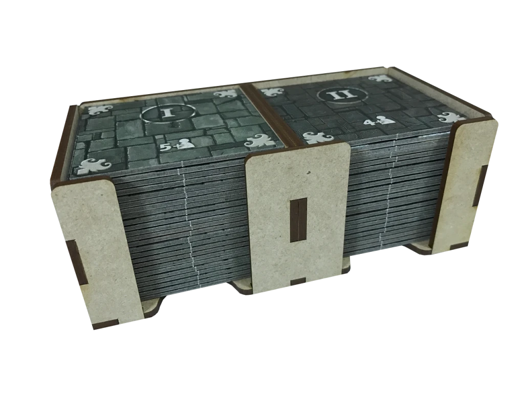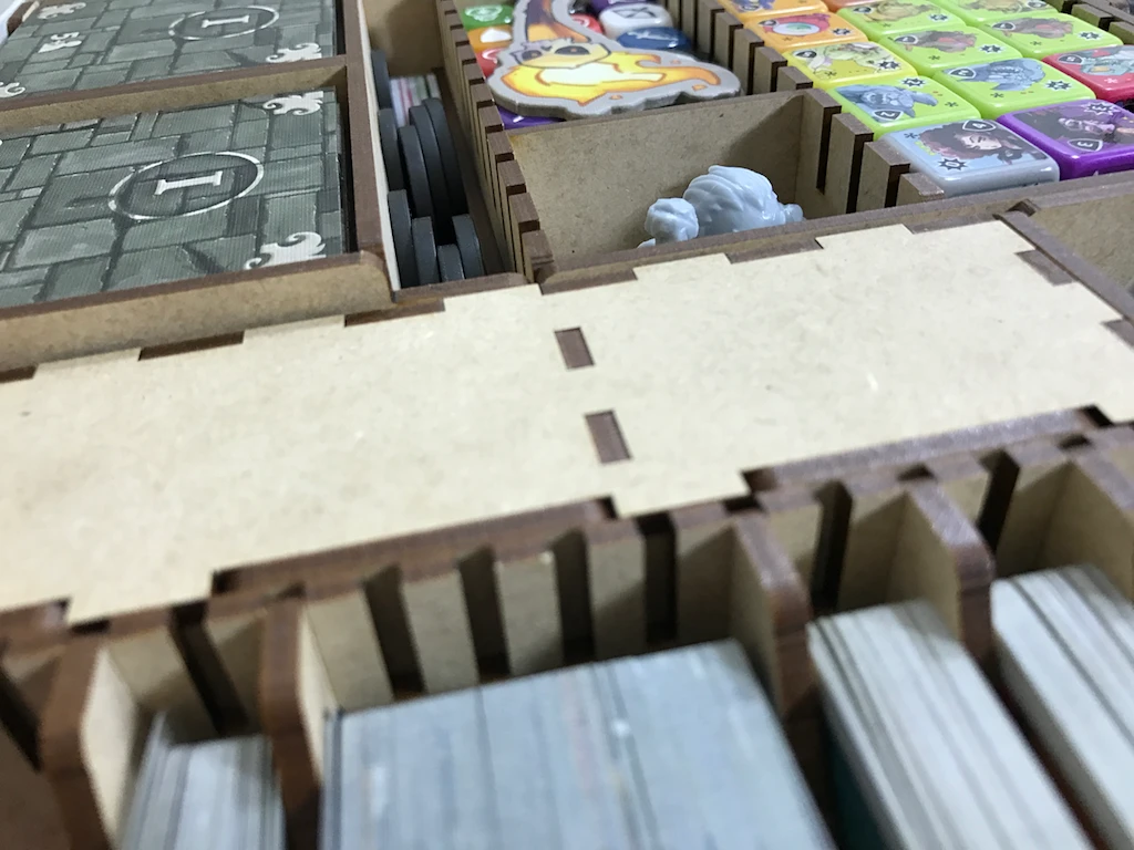 is designed to store the base game, Kickstarter extras, Adventurers Set, Monsters Dice Set, Luke, Promo Dice Set, Arcadia Crossover Kit, Colored Action Dice Pack, Treasure Chest Pack, and Plastic Token Pack. If you don’t sleeve your cards and you bought everything, you will have room for the duplicates (boss tokens, extra dice, free step tokens) in this solution’s card tray. If you sleeve, you will need to store the duplicates elsewhere. If you sleeve your cards, you will need to store your two (2) dice bags on top of deep minis storage tray. Otherwise, they will fit folded in the extra space in the card tray. If you only own the retail version of the game, you will have plenty of expansion space.