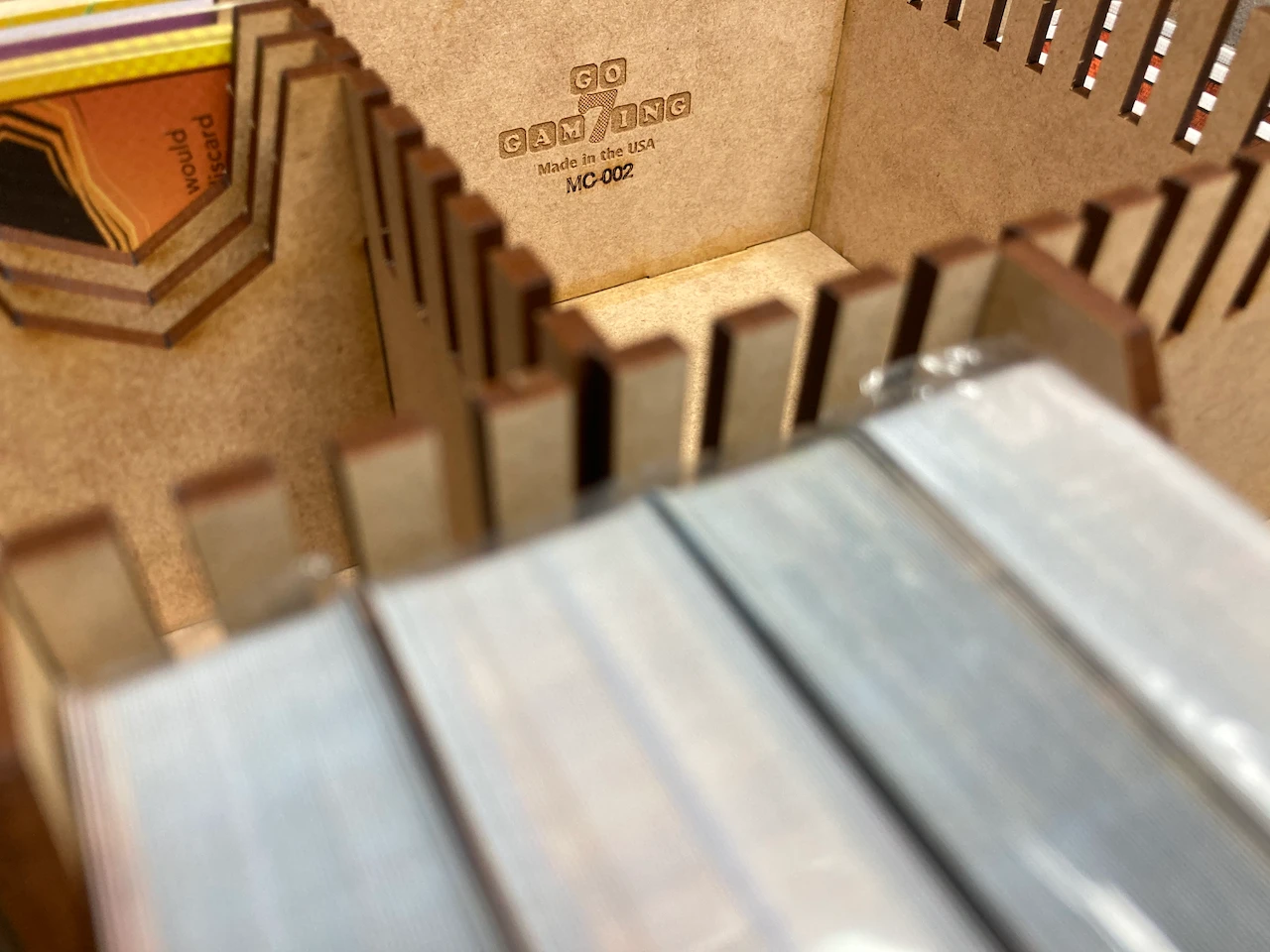 organizer. This solution provides 282mm of large card storage and 92mm of small card storage. Unsleeved cards are .29mm thick; sleeved cards are ~.50mm thick. Each divider is 3mm thick.