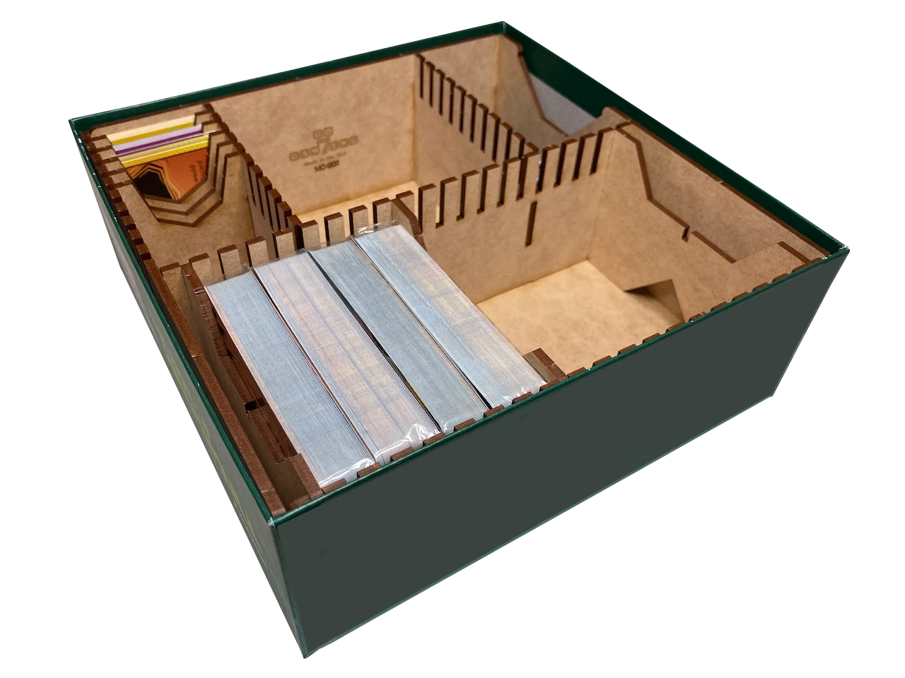 This organizer makes use of what would have been wasted space to store your player dials and small cards, freeing up that space for large cards in your