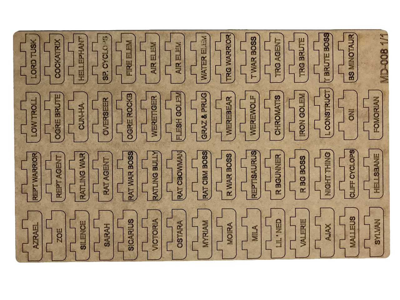 This collection of 59 etched labels includes one etched name tab for each monster class in the game that is not present in the base game. It also includes hero labels for all heroes not present in the base game box. Etched name tabs for heroes and monster classes present in the base game are already included in the