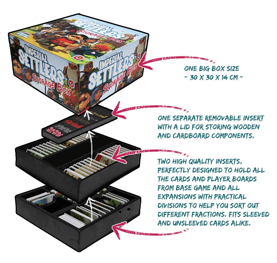 Long awaited Imperial Settlers Storage Box Plus is finally here! This big and awesome box will help you store Imperial Settlers game and all expansions in one big box with style!