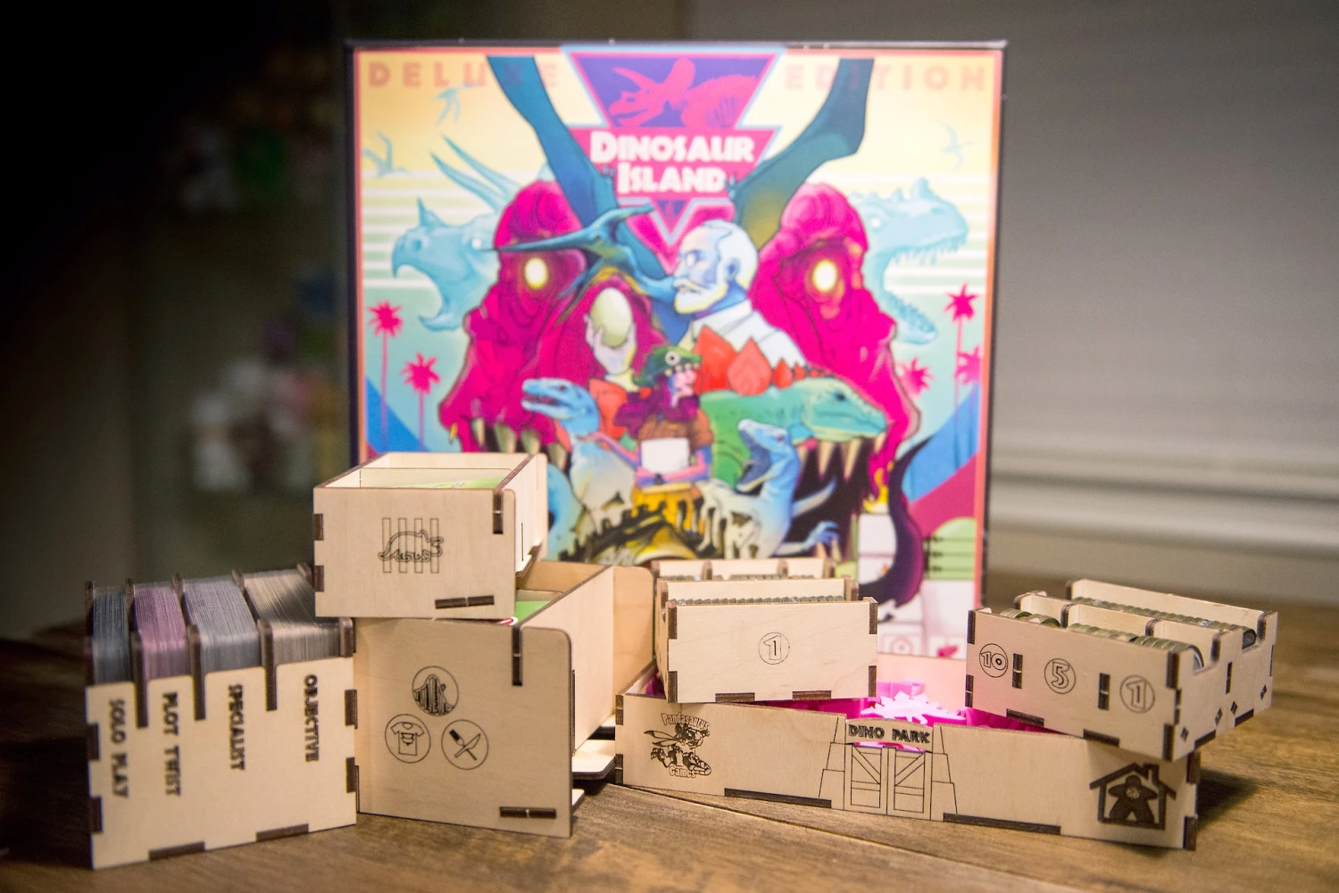 - This insert is designed for the Deluxe edition of Dinosaur Island board game. It can be used for Xtreme edition and the latest print run of the game, but it will lift the box lid by 5 millimeters. This is due to a difference in box height between print runs.