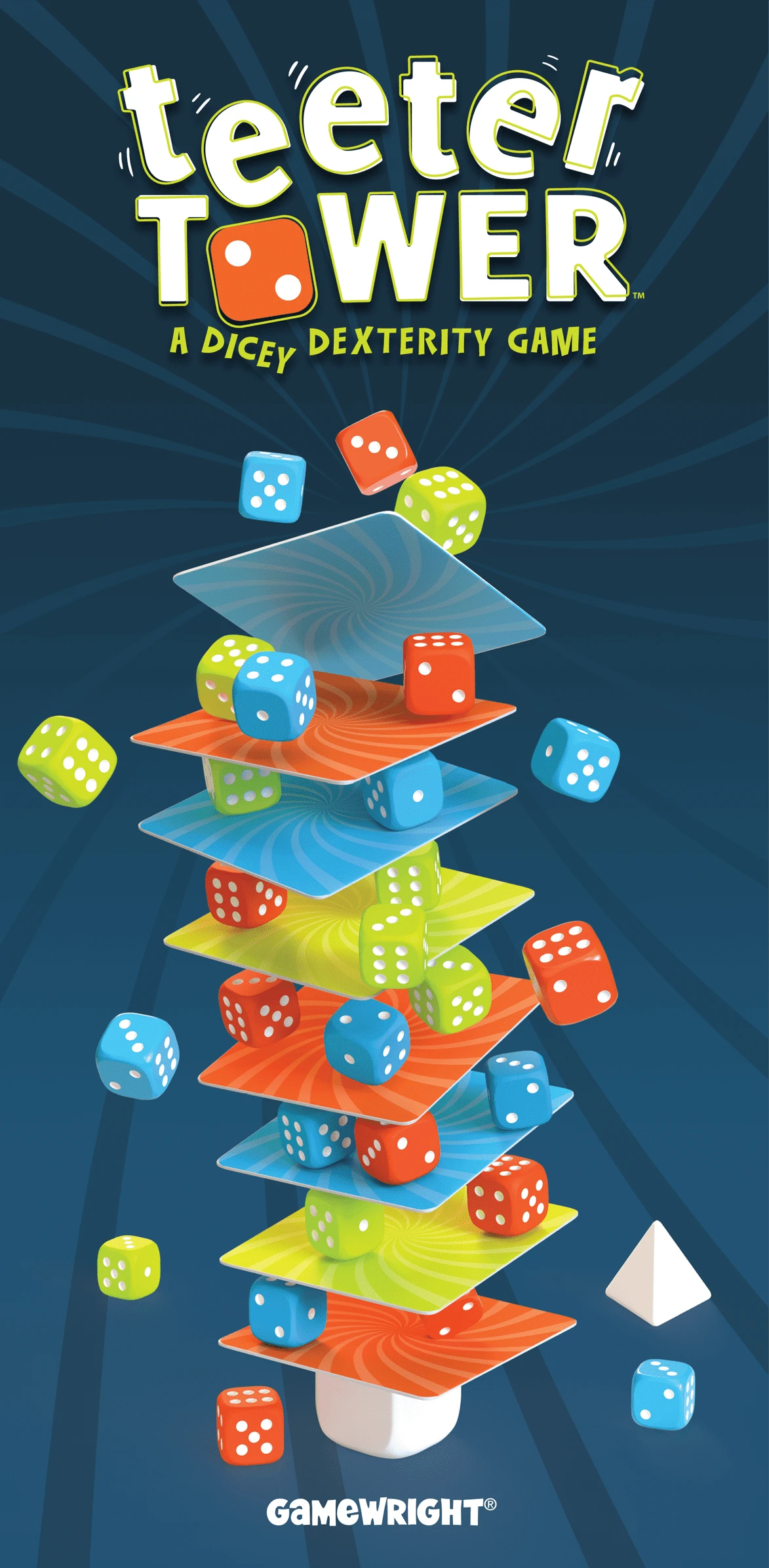 In Teeter Tower, you work as team to roll dice and stack them on each new level. The challenge is that every tile limits dice placement by color and number. Tiles come in three colors — orange, green, and blue — and they have numbered spaces on them. Each turn, you roll dice and can place numbers only in the matching numbered spaces and colors only on the tile of the proper color where no numbered spaces are.